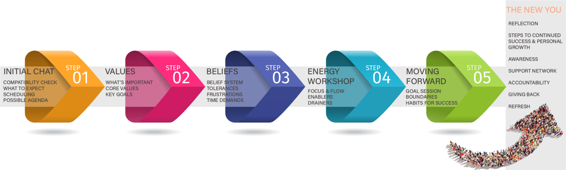 Our coaching programme is individually tailored for every client based on their needs. One size does not fit all! The following shows a typical coaching journey that you can expect with xPotential but this is adjusted for each specific client according to their needs. All clients are provided with a free consultation to confirm that we are compatible for them, to outline what to expect from their coaching journey and to agree the logistics that suits them best.